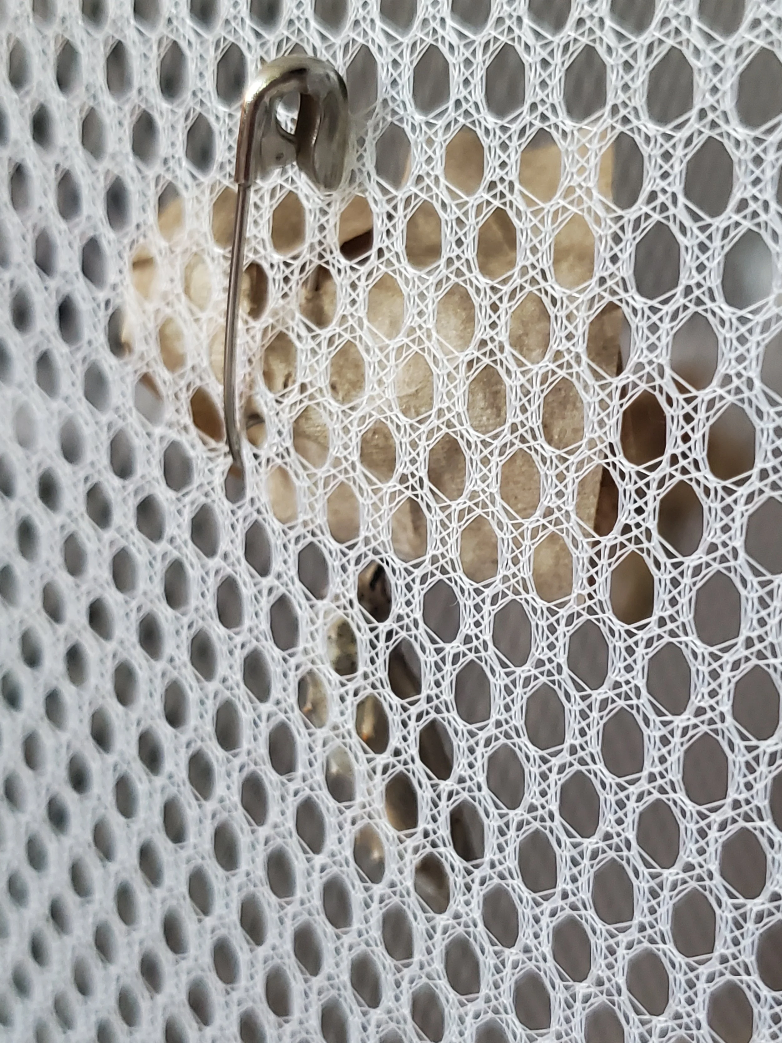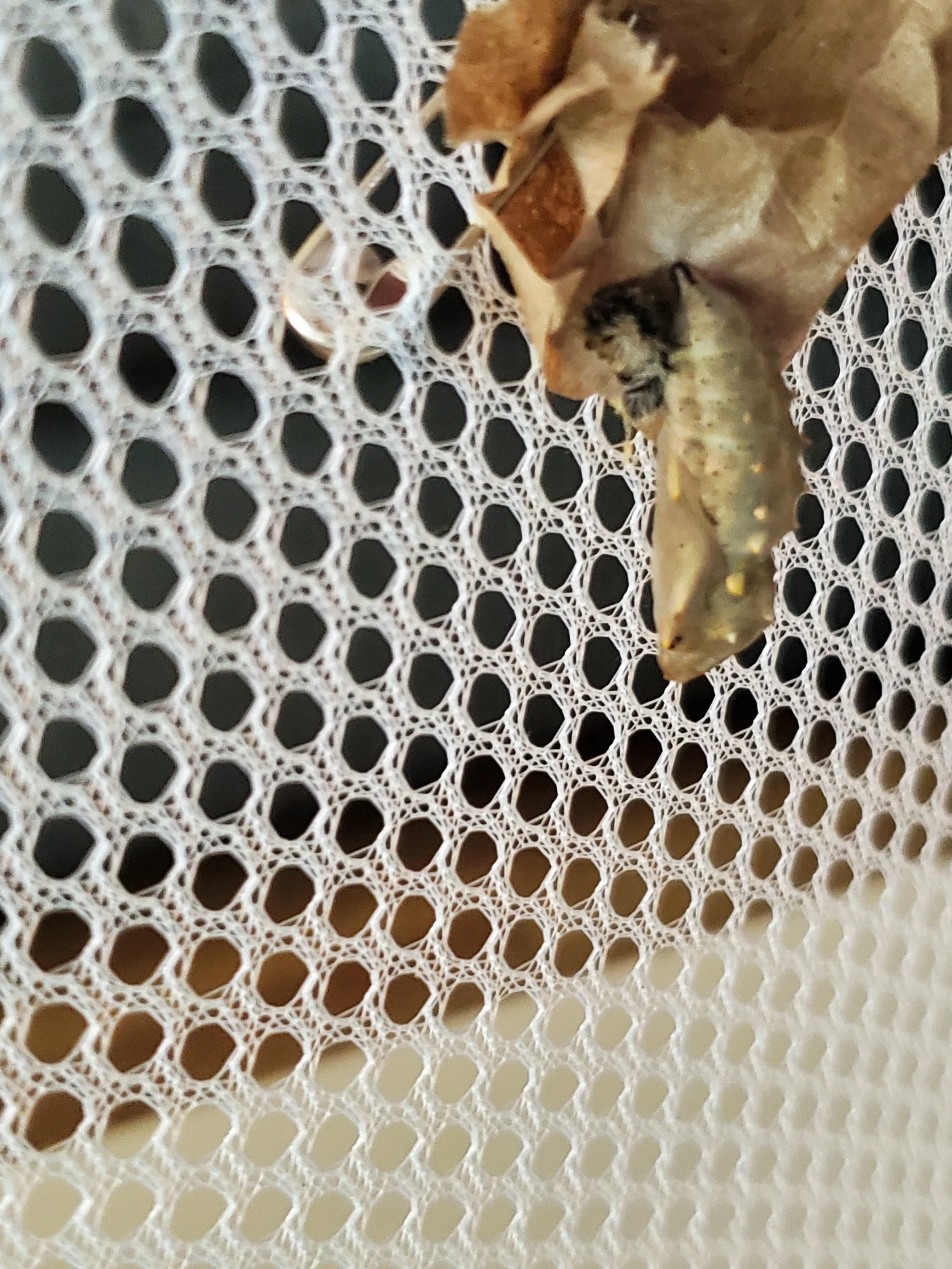 Using a safety pin, find a spot on the paper where the chrysalis isn’t attached. Place the paper with the chrysalis inside the enclosure, and from the outside, pin the paper to the mesh so the chrysalis hangs securely next to the netting. This gives the butterfly space to emerge safely and hang its wings to dry.